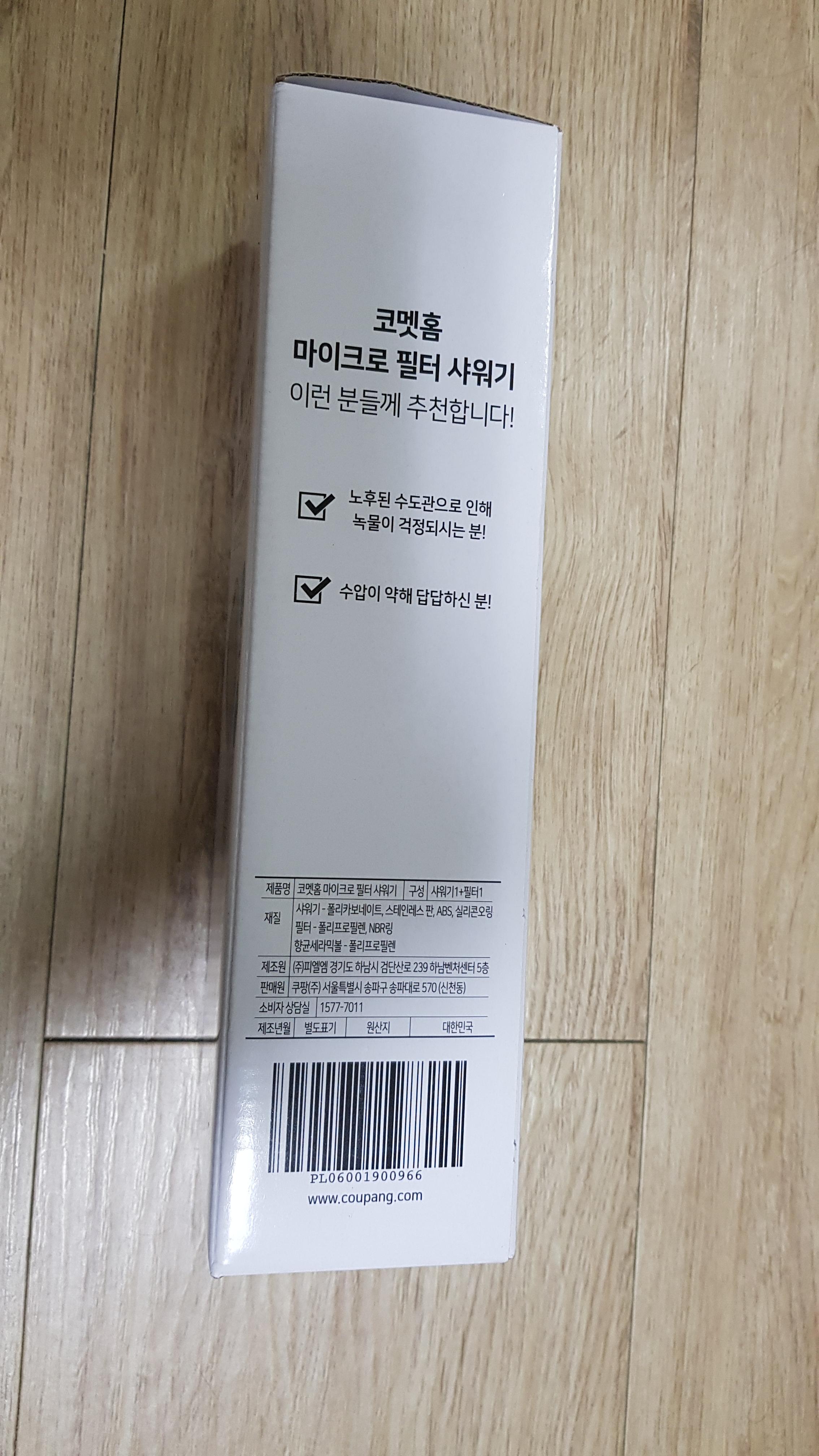 박스는 이렇게 생겼다. 샤워기 본품과 기본으로 필터 한개가 장착되어 들어가 있다고 한다.